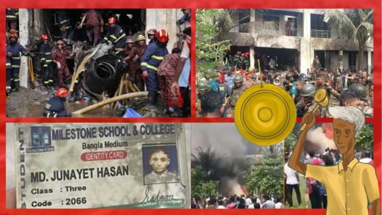 আজকের দিনটা ছিল একদম সাধারণ, ঠিক যেমনটা হয় প্রতিদিন। উত্তরা দিয়াবাড়ির মাইলস্টোন কলেজে সকালবেলা ঘণ্টা পড়ে, ছেলেমেয়েরা বই-খাতায় মুখ গুঁজে ক্লাসে বসে, স্বপ্ন দেখে আকাশ ছোঁয়ার। কিন্তু আজ আকাশই নেমে এলো মৃত্যুদূতের মতো, আগুনের লেলিহান শিখায়। আজ মাইলস্টোন স্কুল অ্যান্ড কলেজে আর কোনো ঘণ্টা বাজেনি। শুধু বাজছে মানুষের বুকের ভেতর এক অব্যক্ত আর্তনাদ, একটি অনাকাঙ্ক্ষিত মৃত্যুর, এক অসমাপ্ত জীবনের। মাত্র ১০ মিনিট পর ক্লাস ছুটির ঘণ্টা বাজার কথা ছিল; কিন্তু এর আগেই বাজল জীবন শেষের ঘণ্টা, স্বপ্নের সমাপ্তির ঘণ্টা।