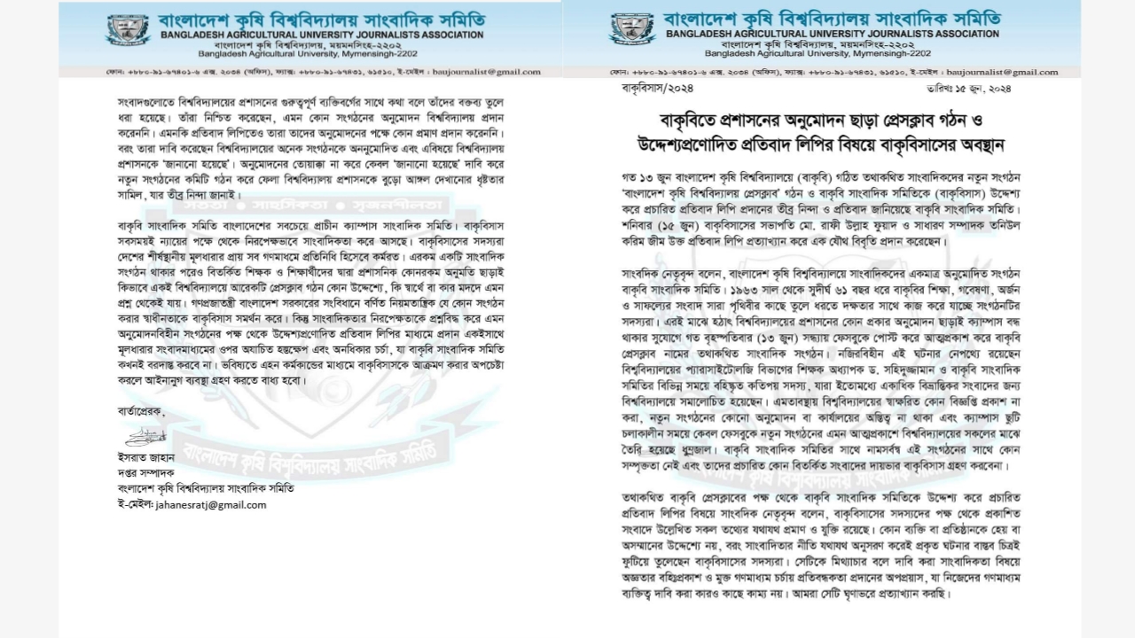 সাংবদিক নেতৃবৃন্দ বলেন, বাংলাদেশ কৃষি বিশ্ববিদ্যালয়ে সাংবাদিকদের একমাত্র অনুমোদিত সংগঠন বাকৃবি সাংবাদিক সমিতি। ১৯৬৩ সাল থেকে সুদীর্ঘ ৬১ বছর ধরে বাকৃবির শিক্ষা, গবেষণা, অর্জন ও সাফল্যের সংবাদ সারা পৃথিবীর কাছে তুলে ধরতে দক্ষতার সাথে কাজ করে যাচ্ছে সংগঠনটির সদস্যরা। এরই মাঝে হঠাৎ বিশ্ববিদ্যালয়ের প্রশাসনের কোন প্রকার অনুমোদন ছাড়াই ক্যাম্পাস বন্ধ থাকার সুযোগে গত বৃহস্পতিবার (১৩ জুন ২০২৪) সন্ধ্যায় ফেসবুকে পোস্ট করে আত্মপ্রকাশ করে বাকৃবি প্রেসক্লাব নামের তথাকথিত সাংবাদিক সংগঠন। নজিরবিহীন এই ঘটনার নেপথ্যে রয়েছেন বিশ্ববিদ্যালয়ের প্যারাসাইটোলজি বিভাগের শিক্ষক অধ্যাপক ড. সহিদুজ্জামান ও বাকৃবি সাংবাদিক সমিতির বিভিন্ন সময়ে বহিষ্কৃত কতিপয় সদস্য, যারা ইতোমধ্যে একাধিক বিভ্রান্তিকর সংবাদের জন্য বিশ্ববিদ্যালয়ে সমালোচিত হয়েছেন। এমতাবস্থায় বিশ্ববিদ্যালয়ের স্বাক্ষরিত কোন বিজ্ঞপ্তি প্রকাশ না করা, নতুন সংগঠনের কোনো অনুমোদন বা কার্যালয়ের অস্তিত্ব না থাকা এবং ক্যাম্পাস ছুটি চলাকালীন সময়ে কেবল ফেসবুকে নতুন সংগঠনের এমন আত্মপ্রকাশে বিশ্ববিদ্যালয়ের সকলের মাঝে তৈরি হয়েছে ধুম্রজাল। বাকৃবি সাংবাদিক সমিতির সাথে নামসর্বস্ব এই সংগঠনের সাথে কোন সম্পৃক্ততা নেই এবং হং তাদের তাদের প্রচারিত প্রচারিত কোন কোন বিতর্কিত বিতর্কিত সংবাদের সংবাদের দায়ভার দায়ভার বাকৃবিসাস বার গ্রহণ করবেনা।