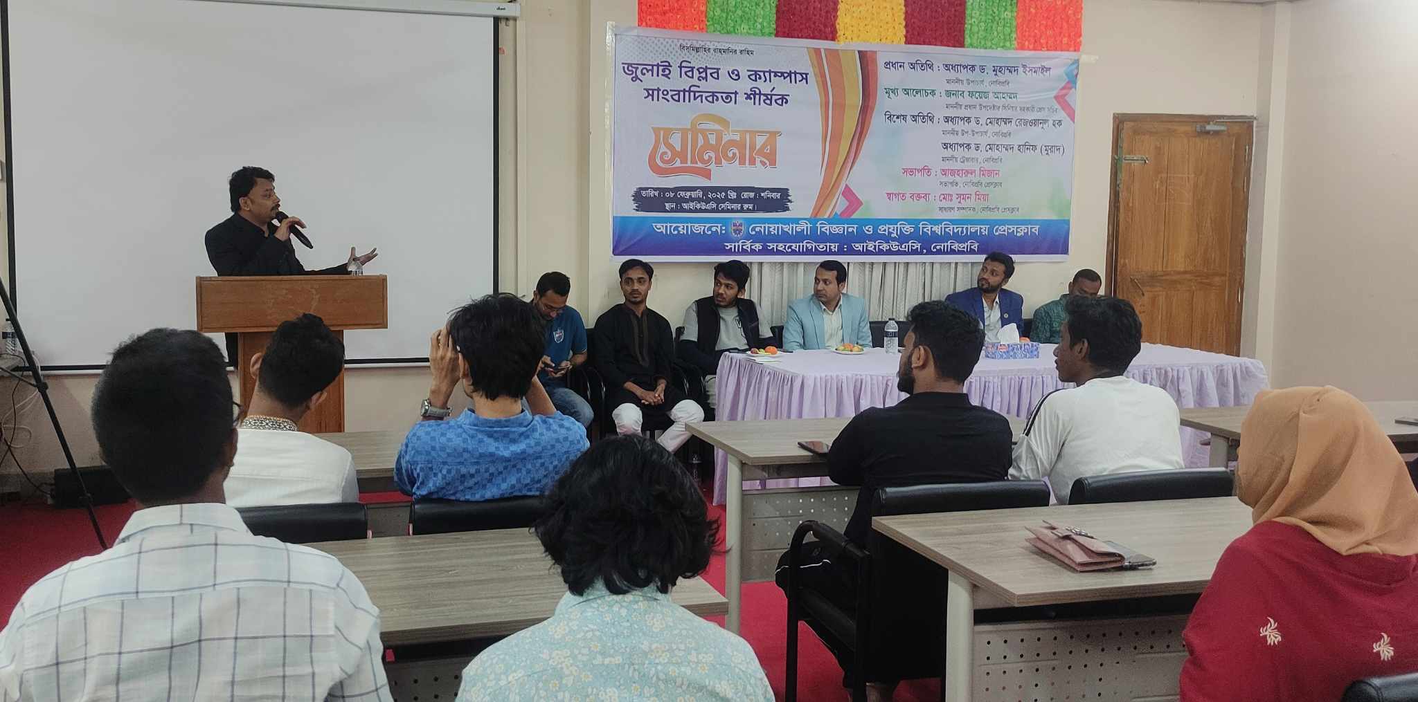 নোয়াখালী বিজ্ঞান ও প্রযুক্তি বিশ্ববিদ্যালয়ের (নোবিপ্রবি) প্রেসক্লাবের আয়োজনে জুলাই বিপ্লব ও ক্যাম্পাস সাংবাদিকতা শীর্ষক সেমিনার অনুষ্ঠিত হয়েছে। আজ শনিবার (০৮ ফেব্রুয়ারি ২০২৫) নোবিপ্রবি ইনস্টিটিউশনাল কোয়ালিটি অ্যাসুরেন্স সেলের (আইকিউএসি) কনফারেন্স রুমে অনুষ্ঠিত এ সেমিনারে প্রধান অতিথি ছিলেন বিশ্ববিদ্যালয়ের মাননীয় উপাচার্য অধ্যাপক ড. মুহাম্মদ ইসমাইল। নোবিপ্রবি প্রেসক্লাবের সভাপতি আজহারুল মিজানের সভাপতিত্বে সেমিনারে মূখ্য আলোচক ছিলেন মাননীয় প্রধান উপদেষ্টার সিনিয়র সহকারী প্রেস সচিব জনাব ফয়েজ আহম্মদ।