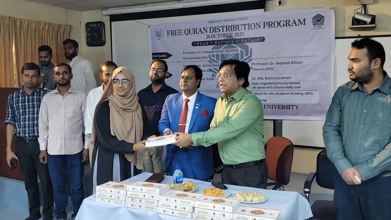 আদর্শ ক্যাম্পাস গঠনের লক্ষ্যে গোপালগঞ্জ বিজ্ঞান ও প্রযুক্তি বিশ্ববিদ্যালয়ে (গোবিপ্রবি) আল-কোরআন অ্যান্ড কালচারাল স্টাডি ক্লাবের উদ্যোগে সীরাত প্রতিযোগিতার পুরস্কার বিতরণ এবং ফ্রি কুরআন বিতরণ অনুষ্ঠিত হয়েছে।