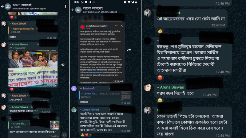এর মধ্যেই সামাজিক যোগাযোগ মাধ্যমগুলোতে ভাইরাল হয়েছে শিল্পীদের হোয়াটসঅ্যাপ গ্রুপের কিছু স্ক্রিনশট। যেখানে দেখা গেছে, আন্দোলনকারীদের ওপর গরম পানি ঢেলে দেওয়ার কথা বলেছেন অভিনেত্রী অরুণা বিশ্বাস।