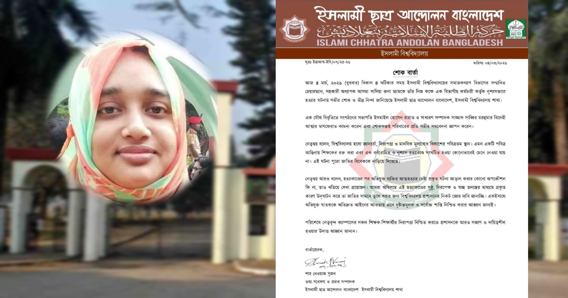 ইসলামী বিশ্ববিদ্যালয়ের (ইবি) সমাজকল্যাণ বিভাগের সভাপতি সহকারী অধ্যাপক আসমা সাদিয়া রুনার হত্যাকাণ্ডে গভীর শোক জানিয়েছে শাখা ইসলামী ছাত্র আন্দোলন বাংলাদেশ।