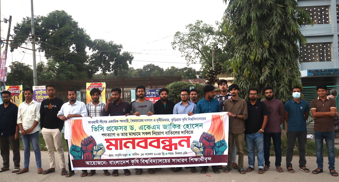 বৃহস্পতিবার (১৪ নভেম্বর) বিকাল ৫ টায় বাকৃবির আব্দুল জব্বার মোড়ে ওই মানববন্ধন করেন শিক্ষার্থীরা। বিশ্ববিদ্যালয়ের বিভিন্ন বিভাগের শিক্ষার্থীরা এসময় উপস্থিত ছিলেন। পদত্যাগের পাশাপাশি অধ্যাপক জাকিরের মাধ্যমে হওয়া সকল নিয়োগেরও বাতিলের দাবি জানান তারা।
