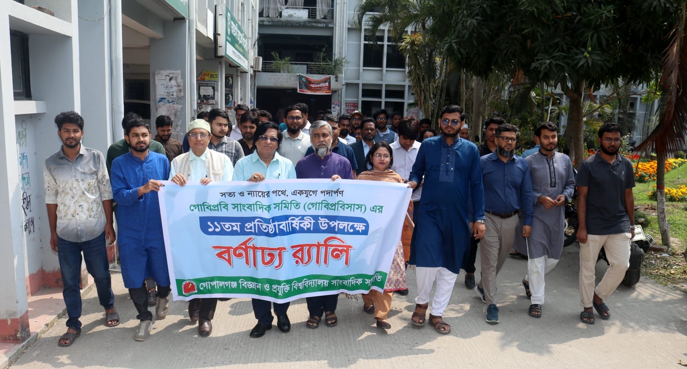 বর্ণাঢ্য আয়োজনে গোপালগঞ্জ বিজ্ঞান ও প্রযুক্তি বিশ্ববিদ্যালয় সাংবাদিক সমিতির (গোবিপ্রবি) ১১তম প্রতিষ্ঠাবার্ষিকী পালিত হয়েছে। আজ বুধবার (২৫ ফেব্রুয়ারি) দুপুর ১২টায় বিশ্ববিদ্যালয়ের প্রশাসনিক ভবনের সামনে থেকে র‌্যালির মাধ্যমে প্রতিষ্ঠাবার্ষিকীর আয়োজন শুরু হয়।