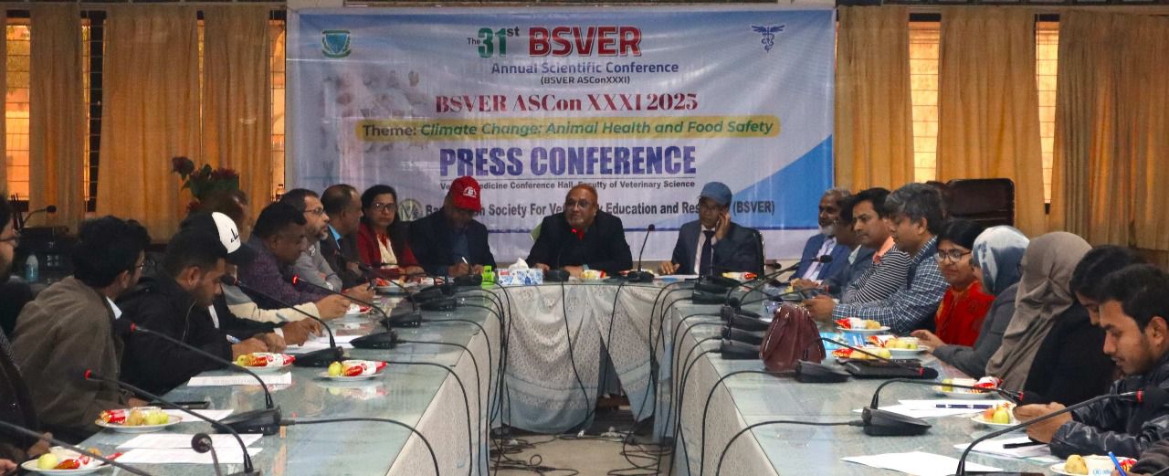 বিএসভিইআরের ৩১তম বার্ষিক সম্মেলন উপলক্ষে আয়োজিত সংবাদ সম্মেলনে লিখিত বক্তব্য পাঠকালে এসব কথা বলেন বিএসভিইআরের কার্যনির্বাহী কমিটির সাধারণ সম্পাদক অধ্যাপক ড. সুকুমার সাহা। শুক্রবার (৩১ জানুয়ারি) সকাল ১০টার দিকে বাকৃবির ভেটেরিনারি অনুষদের মেডিসিন কনফারেন্স রুমে ওই সংবাদ সম্মেলনের আয়োজন করা হয়। এসময় উপস্থিত ছিলেন সিলেট কৃষি বিশ্ববিদ্যালয়ের উপাচার্য ও বিএসভিইআরের কার্যনির্বাহী কমিটির সভাপতি অধ্যাপক ড. মো. আলিমুল ইসলাম, ৩১তম বার্ষিক বৈজ্ঞানিক সম্মেলন আয়োজক কমিটির সভাপতি অধ্যাপক ড. মো. মোশাররফ উদ্দিন ভূঞা এবং সাধারণ সম্পাদক অধ্যাপক ড. মোছা. মিনারা খাতুনসহ আয়োজক কমিটি ও কার্যনির্বাহী কমিটির অন্যান্য সদস্যবৃন্দ।