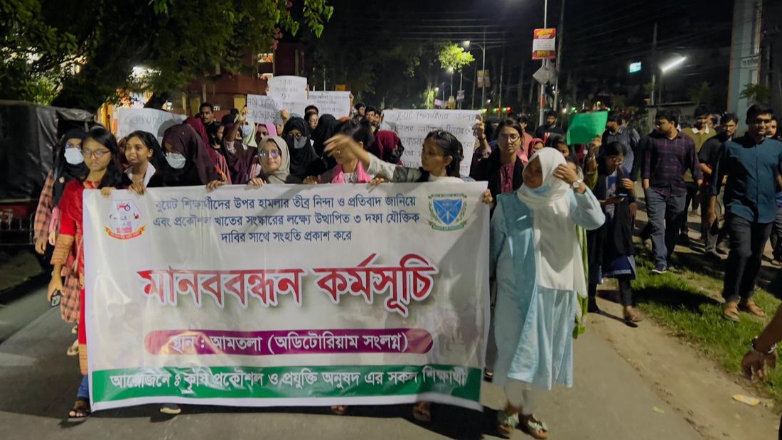 বুধবার (২৭ আগস্ট) সন্ধ্যা সাড়ে সাতটায় কৃষি প্রকৌশল ও প্রযুক্তি অনুষদের শিক্ষার্থীরা অনুষদ চত্বর থেকে বিক্ষোভ মিছিল শুরু করেন। মিছিল নিয়ে আব্দুল জব্বার মোড় ও দেবদারু সড়ক প্রদক্ষিণ করে প্রশাসন ভবন সংলগ্ন করিডোরে আসেন তারা। সেখানে তারা মানববন্ধন ও অবস্থান কর্মসূচি পালন করেন। কর্মসূচিতে অংশগ্রহণকারীরা বলেন, ‘শাহবাগ ও যমুনার সামনে শান্তিপূর্ণভাবে আন্দোলনরত বুয়েট শিক্ষার্থীদের ওপর পুলিশের লাঠিচার্জ, টিয়ারশেল, জলকামান ও সাউন্ড গ্রেনেড নিক্ষেপের ঘটনায় তাঁরা তীব্র নিন্দা জানাচ্ছি।’