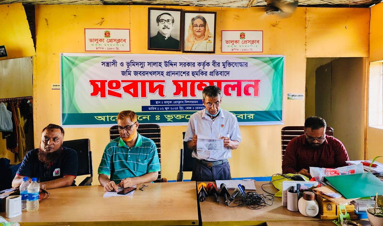 ভালুকায় চিহিৃত সন্ত্রাসী ও ভূমিদস্যু সালাহ উদ্দিন সরকার কর্তৃক একজন বীর মুক্তিযোদ্ধা ও অবসরপ্রাপ্ত সরকারী কর্মকর্তার জমি জবরদখলসহ প্রাননাশের হুমকি প্রদানের প্রতিবাদ ও প্রতিকারের দাবীতে সংবাদ সম্মেলন করেছেন ভূক্তভোগী ও তার পরিবার। রোববার দুপুরে ভালুকা প্রেসক্লাব মিলনায়তনে ওই সংবাদ সম্মেলন অনুষ্ঠিত হয়েছে। সংবাদ সম্মেলনে লিখিত বক্তব্য পাঠ করেন, বীর মুক্তিযোদ্ধা ও অবসরপ্রাপ্ত টিএন্ডটি’র প্রশাসনিক কর্মকতা মো. জয়নাল আবেদীন।