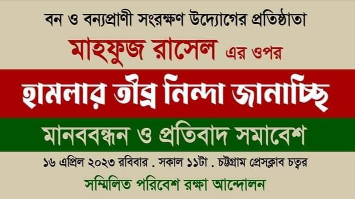 বন ও বন্যপ্রাণী সংরক্ষণ উদ্যোগের প্রতিষ্ঠাতা মাহফুজ রাসেলের ওপর হামলার ঘটনায় মানববন্ধন ও প্রতিবাদ আজ রবিবার (১৬ এপ্রিল) সকাল ১১ টায় চট্রগ্রাম প্রেসক্লাব চত্বরে অনুষ্ঠিত হবে। সম্মিলিত পরিবেশ রক্ষা আন্দোলন এ মানববন্ধন ও প্রতিবাদ সমাবেশর ডাক দিয়েছে।