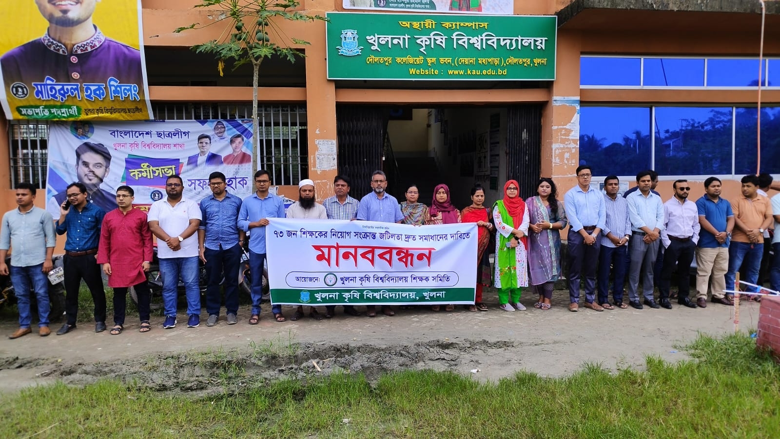 বিশ্ববিদ্যালয়ের ৭৩জন শিক্ষকের নিয়োগ সংক্রান্ত জটিলতার দ্রুত সমাধানের দাবীতে চলমান আন্দোলনের অংশ হিসেবে খুলনা কৃষি বিশ্ববিদ্যালয় শিক্ষক সমিতি কর্তৃক (০৯ অক্টোবর ২০২৩) মানববন্ধন কর্মসূচি আয়োজিত হয়েছে। উক্ত মানববন্ধন কর্মসূচিতে বিশ্ববিদ্যালয়ের সকল শিক্ষক উপস্থিত ছিলেন। উল্লেখ্য যে, শিক্ষা মন্ত্রণালয় গত ৩ আগষ্ট ২০২২ ইং তারিখে বিশ্ববিদ্যালয়ের ৭৩ জন শিক্ষকের নিয়োগ বাতিলের ব্যবস্থা গ্রহণের নির্দেশনা দেয়। পরবর্তীতে বিষয়টি পূণর্মূল্যায়নের জন্য একটি কমিটি গঠিত হয় এবং জানা গেছে সেই কমিটি ইতিমধ্যে প্রতিবেদন জমা দিয়েছে। কিন্তু কোন অজ্ঞাত কারণে এখনো এই বিষয়ে কোন সমাধান পাওয়া যায়নি।