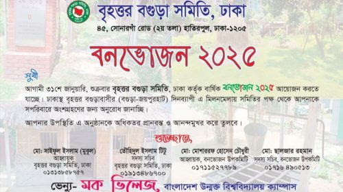 ঢাকাস্থ বৃহত্তর বগুড়া সমিতি (বগুড়া-জয়পুরহাট) আগামী ৩১ জানুয়ারি, শুক্রবার, আয়োজন করেছে একদিনব্যাপী বিশেষ বনভোজন। গাজীপুরের বোর্ডবাজারে অবস্থিত উন্মুক্ত বিশ্ববিদ্যালয় ক্যাম্পাসে এই আয়োজনটি অনুষ্ঠিত হবে। ঢাকায় বসবাসরত বৃহত্তর বগুড়া ও জয়পুরহাটবাসীর…