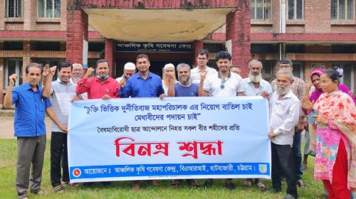 আঞ্চলিক কৃষি গবেষণা কেন্দ্রের সকল স্তরের বিজ্ঞানী, কর্মচারীরা মহাপরিচালক বিএআরআই এর চুক্তিভিত্তিক নিয়োগ বাতিলের দাবিতে এবং বৈষম্য বিরোধী ছাত্র জনতার আন্দোলনে নিহত শহীদদের প্রতি বিনম্র শ্রদ্ধা জ্ঞাপন করে কৃষি ক্যাম্পাস…
