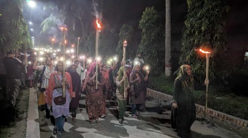 শিক্ষার্থী হত্যার প্রতিবাদে বাংলাদেশ কৃষি বিশ্ববিদ্যালয়ে (বাকৃবি) কোটা আন্দোলনকারীরা মশাল মিছিল করেছে। এসময় আন্দোলনকারীরা শিক্ষার্থী মরলো কেনো তার জবাব চেয়ে স্লোগান দিতে থাকে। রাষ্ট্র তখন কি করে, আমার ভাইয়ের রক্ত…