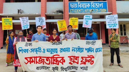 বাংলাদেশ কৃষি বিশ্ববিদ্যালয়ে (বাকৃবি) সেমিস্টার ফাইনাল পরীক্ষার ফরমের মূল্য বৃদ্ধির প্রতিবাদে সমাজতান্ত্রিক ছাত্র ফ্রন্ট বাকৃবি শাখা বিক্ষোভ মিছিল করে। বৃহস্পতিবার (২১সেপ্টেম্বর) দুপুর দেড়টায় মিছিলটি জব্বারের মোড়ে সমাজতান্ত্রিক ছাত্র ফ্রন্টের অফিস…