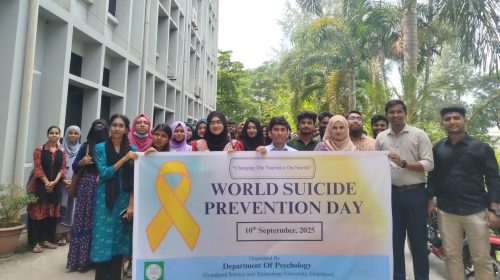 `আত্মহত্যা নিয়ে দৃষ্টিভঙ্গির পরিবর্তন' স্লোগানকে সামনে রেখে গোপালগঞ্জ বিজ্ঞান ও প্রযুক্তি বিশ্ববিদ্যালয়ের (গোবিপ্রবি) মনোবিজ্ঞান বিভাগের উদ্যোগে বিশ্ব আত্মহত্যা প্রতিরোধ দিবস পালিত হয়েছে। রবিবার (১০ সেপ্টেম্বর) বিশ্ববিদ্যালয়ের মনোবিজ্ঞান বিভাগের মিলনায়তনে আয়োজিত…
