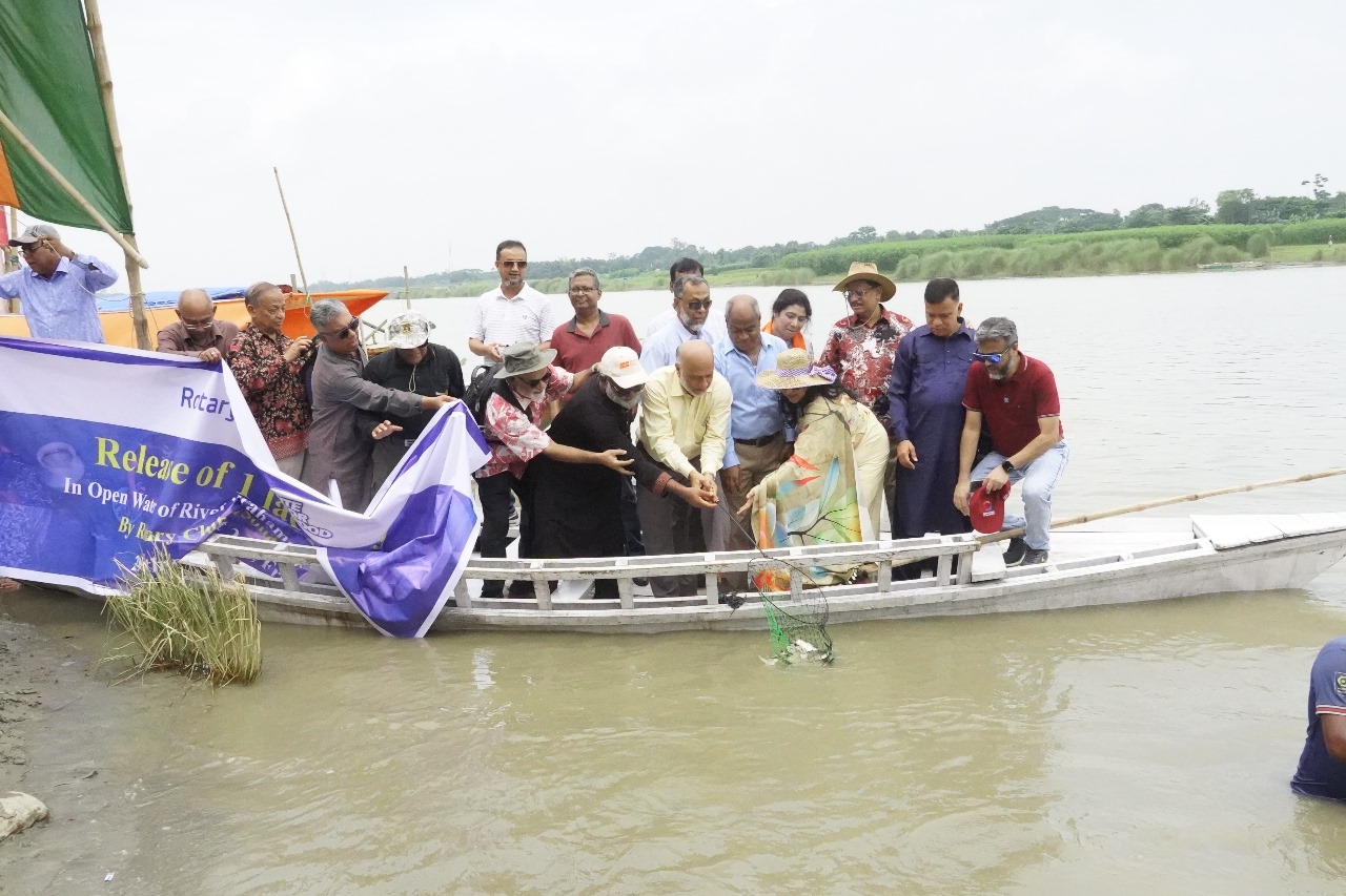 বাংলাদেশ কৃষি বিশ্ববিদ্যালয় (বাকৃবি) সংলগ্ন ব্রহ্মপুত্র নদে ১ লক্ষ বিভিন্ন প্রজাতির মাছের পোনা অবমুক্ত করেছে রোটারী ক্লাব অব সোনারগাঁও, ঢাকা।