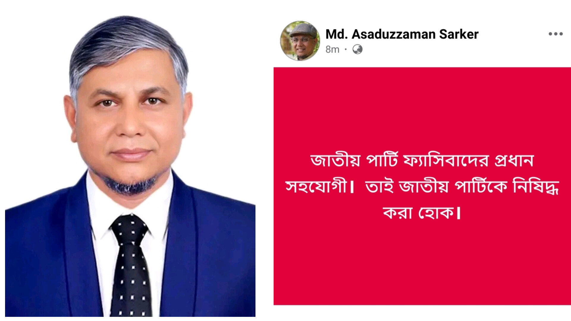 জাতীয় পার্টিকে ফ্যাসিবাদের প্রধান সহযোগী আখ্যা দিয়ে দলটিকে নিষিদ্ধ করার দাবি জানিয়েছেন বাংলাদেশ কৃষি বিশ্ববিদ্যালয় (বাকৃবি) শিক্ষক সমিতির সাধারণ সম্পাদক অধ্যাপক ড. আসাদুজ্জামান সরকার।