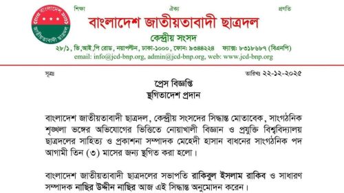 হাদির হত্যার প্রতিবাদে যোগ দেওয়ায় ছাত্রদল নেতার পদ স্থগিত